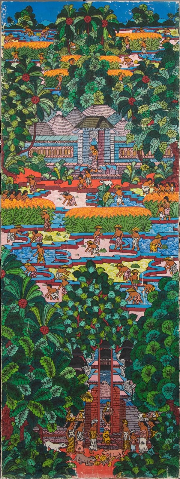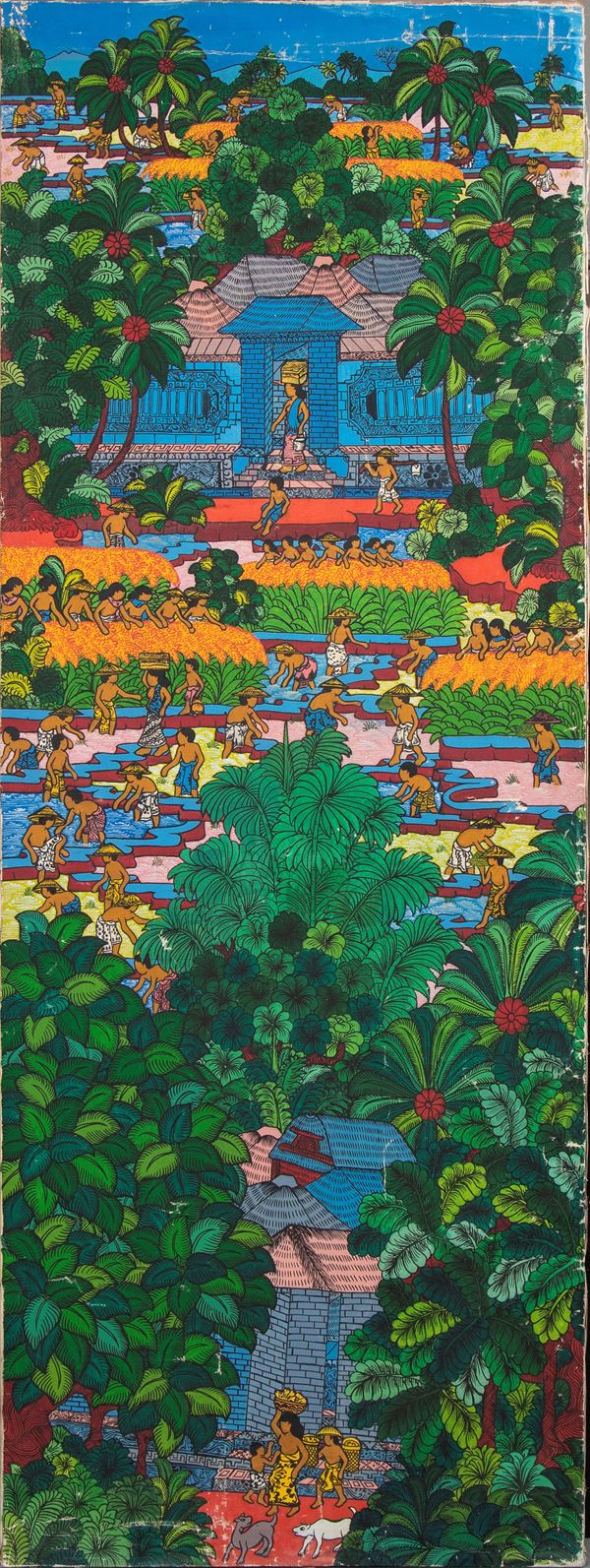 Grandi dipinti costituiti da tre pannelli raffiguranti un villaggio balinese e campi di riso.