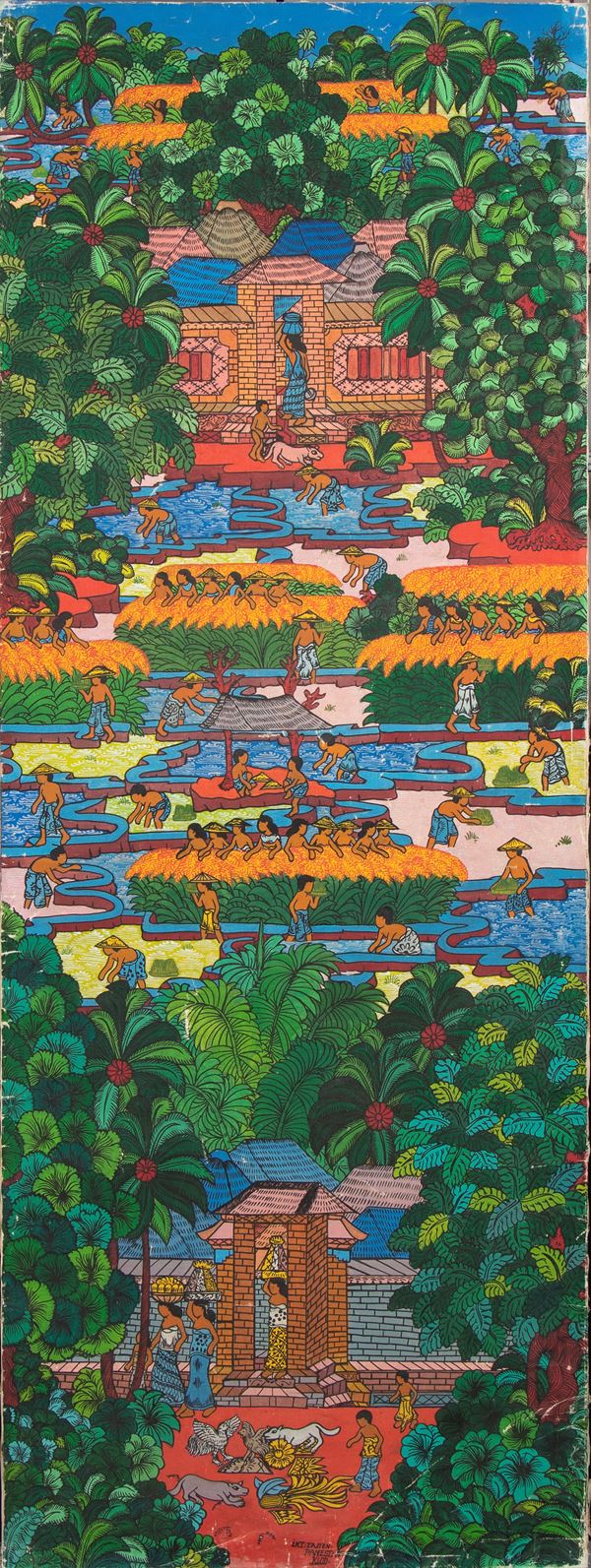 KETUT TAGEN, allievo di Arie Smit, è uno degli artisti più rappresentativi della scena di Penestanan, Bali, abile a combinare colori vivaci in scene che descrivono la vita quotidiana tradizionale di quel villaggio. Sua specifica caratteristica è l'assenza sui volti di dettagli anatomici.