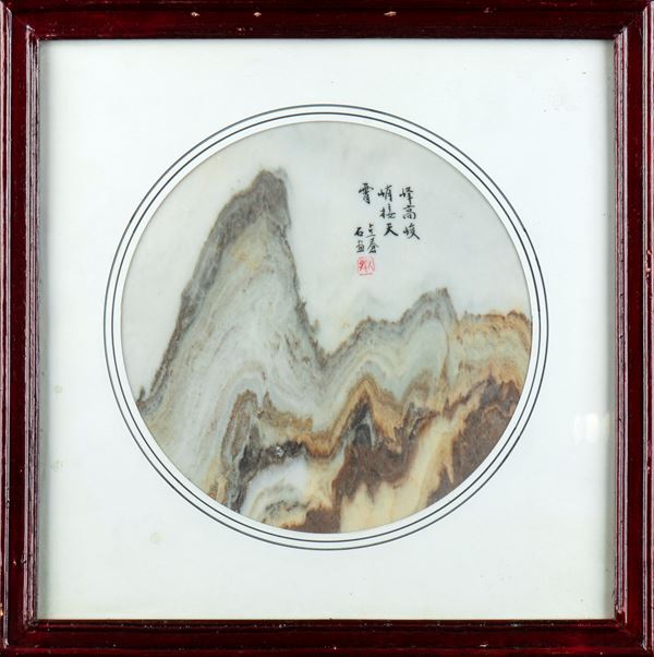 Lastra ornamentale in marmo “Dali” di forma circolare con iscrizione e sigillo, incorniciata. Questa particolare varietà di marmo viene dalla regione sud-occidentale dello Yunnan ed è nota con il nome di Dali, dalla città che si trova prossima ai tradizionali centri di estrazione. Queste lastre decorative che abbellivano gli studi dei letterati sono anche note come "pietre del sogno", in virtù delle dei particolari effetti creati dalle venature naturali della pietra e che evocano spesso, come in questo caso, paesaggi montuosi.