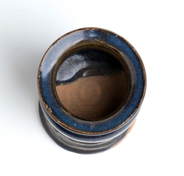 Piccolo vaso tripode in forma di brucia incenso sulla sua base, la ceramica in gres a coperta colore blu scuro con sfumature di tipo junyao che vira verso il rosso.