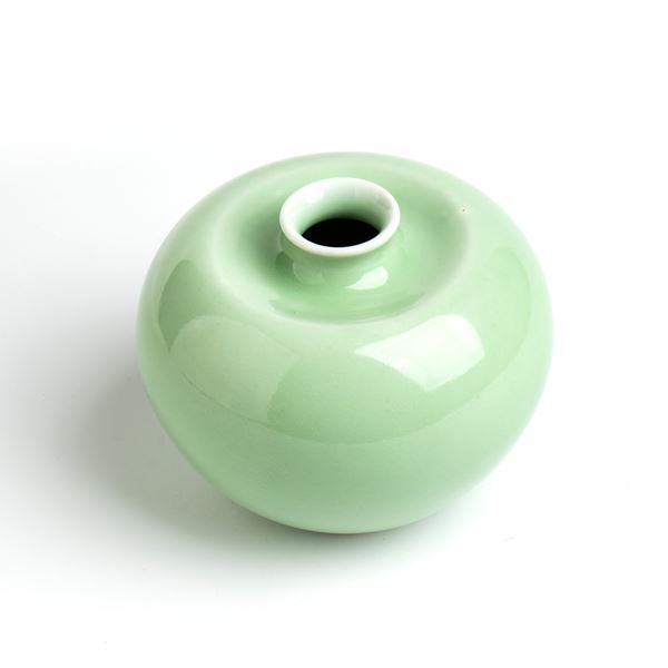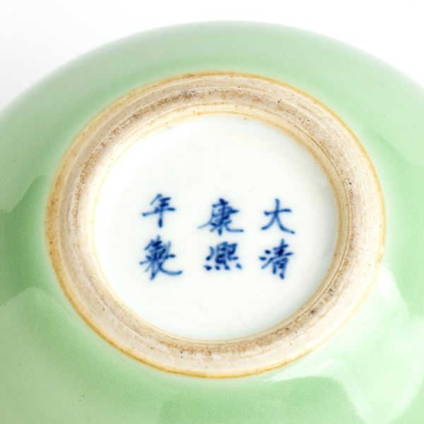 Piccolo vaso “water dropper” di forma schiacciata invetriata e coperta con celadon; marchio "kangxi" a 6 caratteri blu sotto la base.
