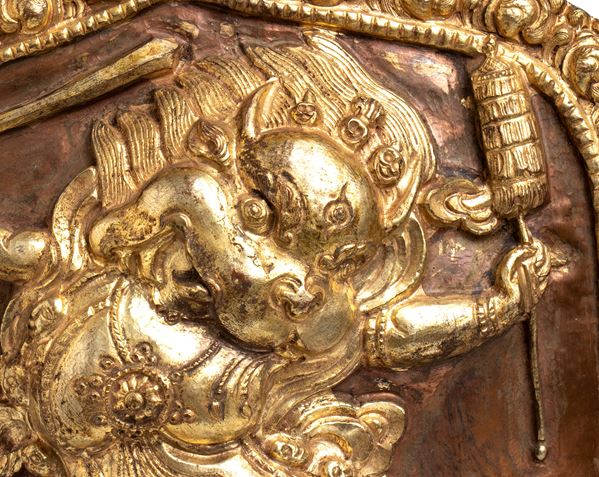 Placca in rame sbalzata repoussé, Cina, Tibet, dinastia Qing, XIX secolo.