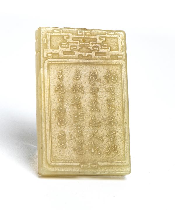 Placchetta rettangolare in giada decorata a leggero rilievo con letterati e poema sul retro, provvista di foro di sospensione.