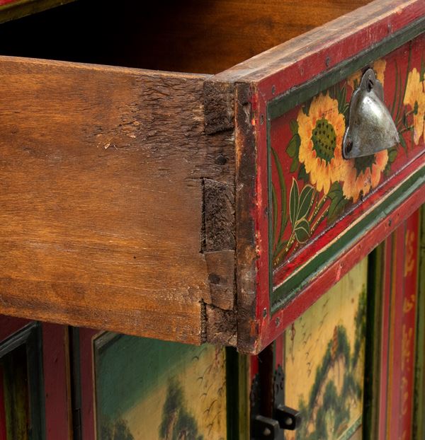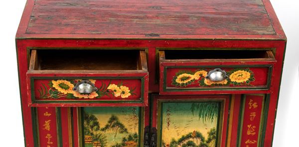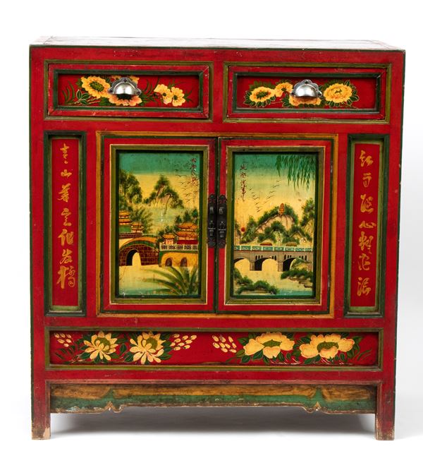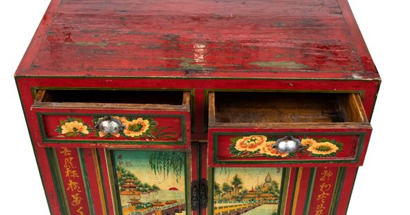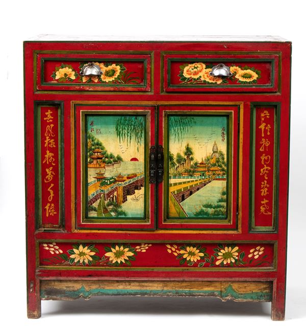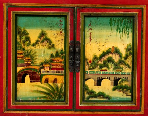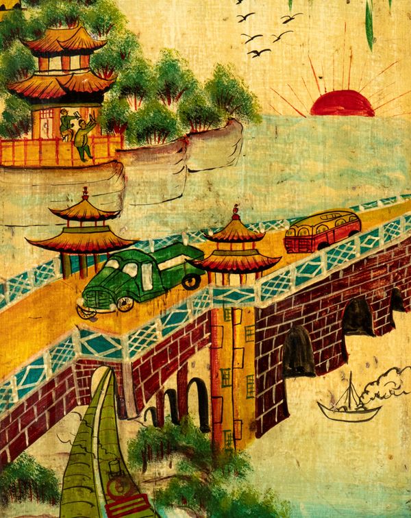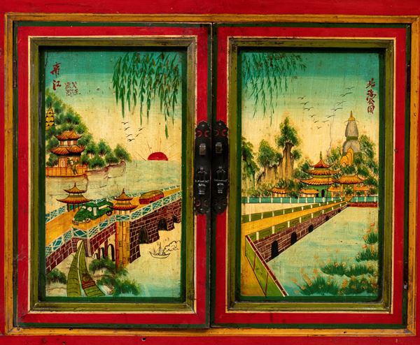 Rara coppia di mobili di design cinesi con decori di monumenti e pagode della Cina imperiale con insolita raffigurazione di numerosi simboli dell’iconografia maoista. Due guardie rosse affacciate al balcone della pagoda stringono tra le mani il libretto rosso circondati dai raggi del sole rosso che “illumina il popolo”, il progresso industriale viene rappresentato con le macchine e gli autobus sfreccianti su i ponti e una nave a vapore nell’acqua. La campagna politica di questa epoca guidata da Mao Zedong mirava a trasformare la “vecchia cultura” per affermare quella nuova. Questo ha avuto un forte impatto sulla produzione di oggetti d’arte, come in questo caso sui mobili.