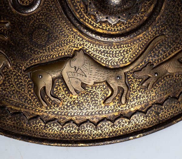 Scudo in ferro ageminato (koftghari) a racemi vegetali e applicazioni in forma di animali.