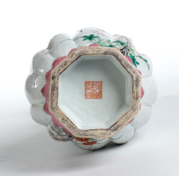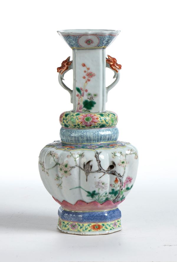 Vaso a balaustro di forma insolita e bordo superiore polilobato dipinto a smalti policromi su più registri, creando una sorta di composizione multilivello. Manici in forma di draghi chilong. Marchio apocrifo Qianlong dipinto in rosso sovraccoperta sotto la base.