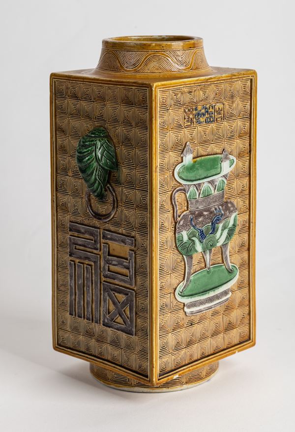 Vaso Cong in porcellana invetriata color senape, Cina, periodo Repubblica (1912-1949)