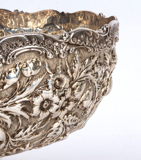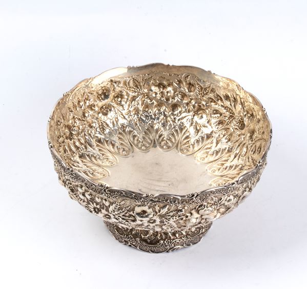 di forma circolare sbalzato e cesellato con motivi floreali sul corpo e sul piede, bordi sagomati.