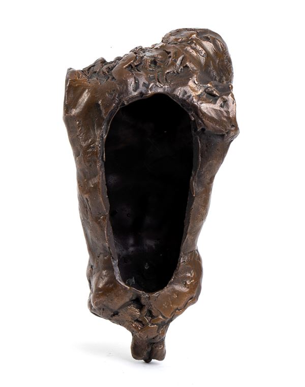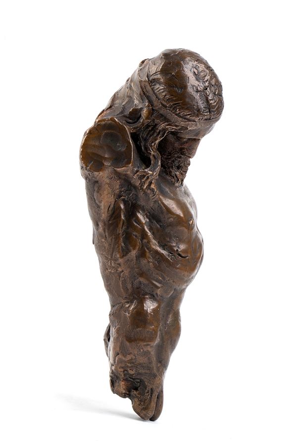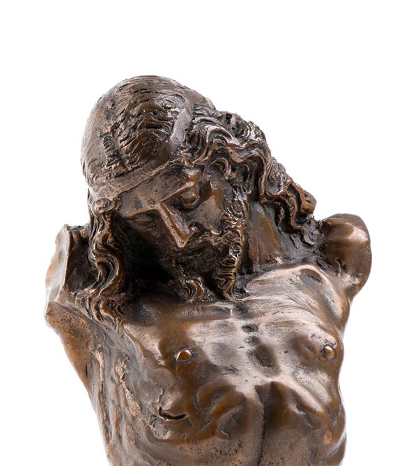 realizzato con la tecnica della fusione con grande cura nella definizione anatomica e nei dettagli espressivi. L’opera mostra Gesù dalla sommità del capo fino alle parti intime, senza le braccia. La testa è inclinata verso la spalla destra, con gli occhi chiusi, secondo l’iconografia del Christus patiens. I tratti del volto sono intensi: la barba e la capigliatura sono ricce, mentre il torso è muscoloso, scolpito in modo realistico. Sul fianco destro del busto è inciso un monogramma con la lettera "T", probabilmente una firma d’autore o un segno distintivo di bottega.