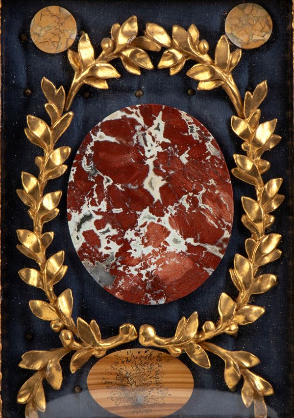 in cornice in legno dorata, souvenir che mostra un campionario di marmi e diaspro tipico del periodo del Gran Tour.