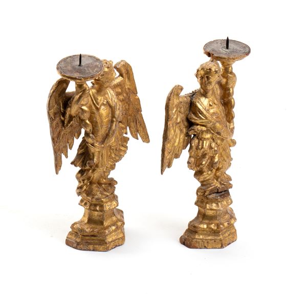 reggi-cero a forma di angeli in legno intagliato e dorato.
