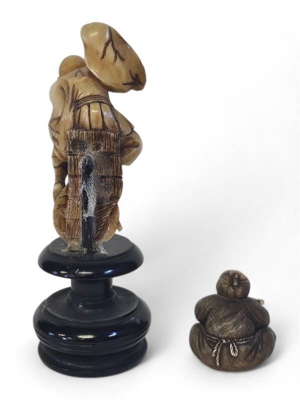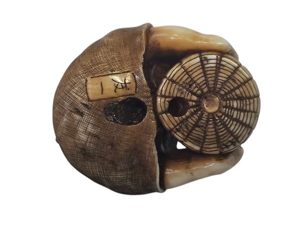L’altro okimono mostra un uomo accovacciato dall’'espressione allegra, intento a lavorare con un cesto, probabilmente legato a un'attività quotidiana come la raccolta o la cucina. Anche qui i dettagli sono lavorati con estrema attenzione: l’espressione del volto, le mani e il cesto intrecciato.