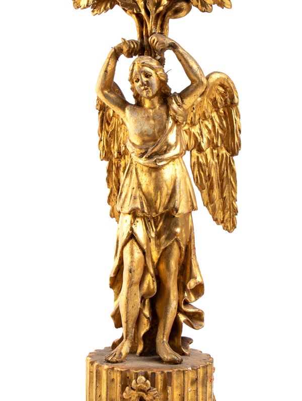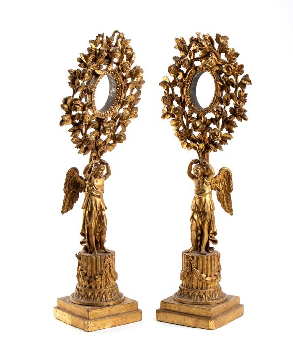 composti da due angeli intagliati in legno dorato con ali ampiamente spiegate. Questi angeli sono appoggiati su due colonne rastremate, che richiamano l'estetica classica dell'ordine corinzio. Le colonne, a loro volta, poggiano su basi quadrate, decorate con gradini. Gli angeli, nella loro posizione ieratica, reggono con le mani ghirlande elaborate di fiori e foglie, simbolo di sacralità e di una connessione profonda con la natura divina. Queste ghirlande non sono solo elementi decorativi, ma fungono anche da cornici per le reliquie centralmente collocate, ora mancanti.