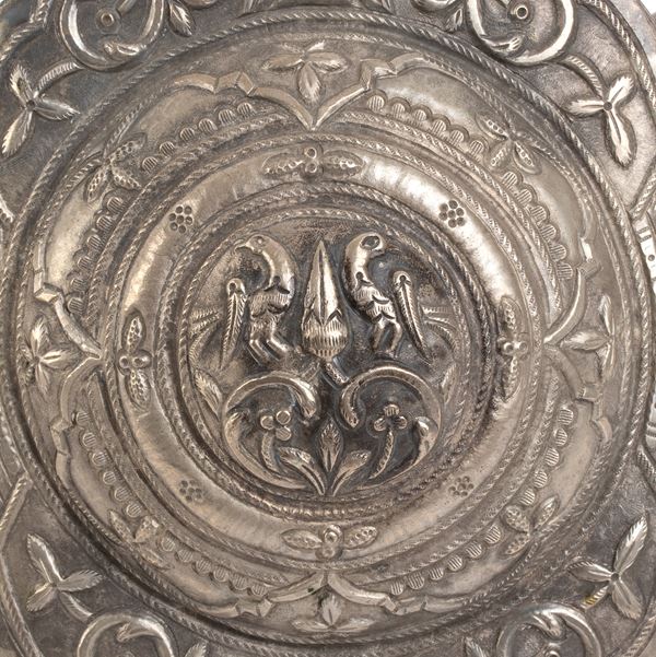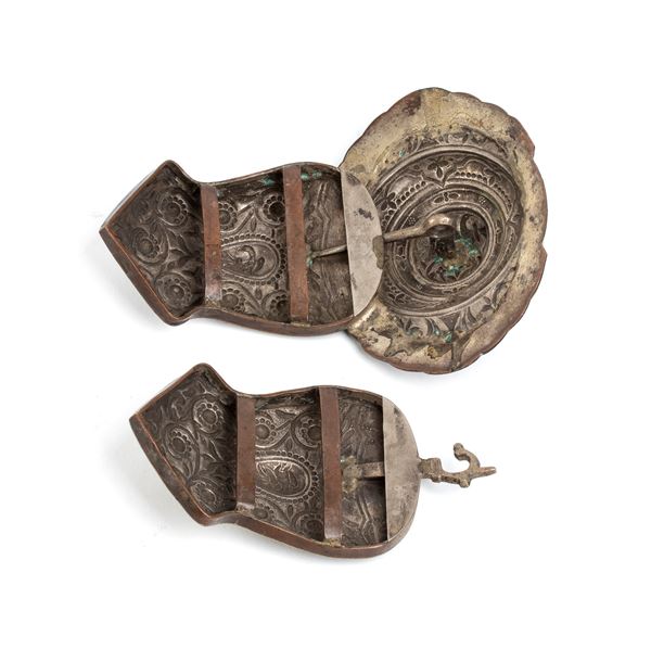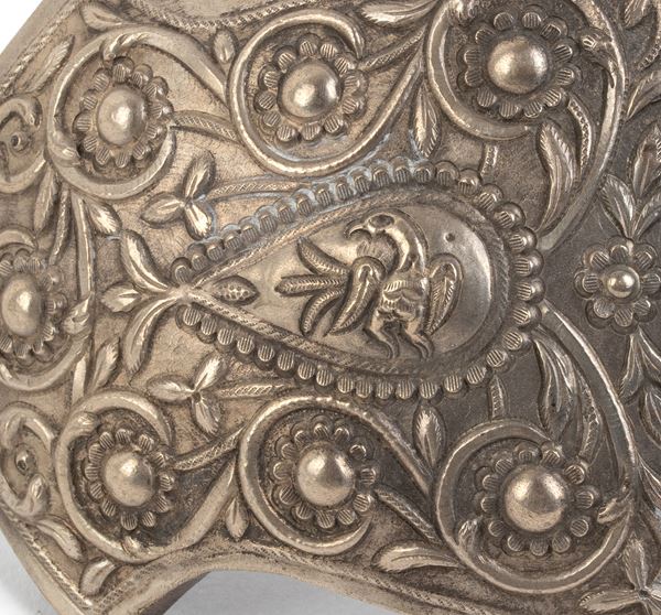 in metallo argentato, costituita da due elementi che si uniscono sul retro tramite un sistema di incastro. La superficie è ornata con motivi a volute fogliate e floreali, tipici dell’arte ornamentale dell’area himalayana. La parte centrale della fibbia è di forma ovale, evidenziata da una decorazione a cerchi concentrici che incorniciano la scena principale: due uccellini affrontati, probabilmente simbolici, posizionati uno di fronte all’altro in posizione speculare. Gli uccelli, elementi ricorrenti nell’arte nepalese e tibetana, possono rappresentare l’unione, la prosperità o la spiritualità, a seconda del contesto culturale e religioso. Fibbie simili erano spesso usate per ornare cinture femminili nei costumi cerimoniali o tradizionali delle etnie dell’area himalayana, sia come elemento funzionale che come gioiello decorativo.