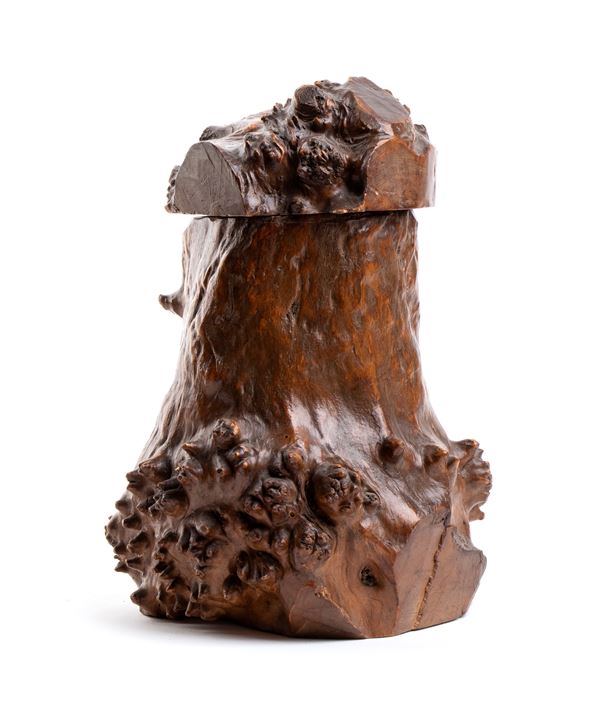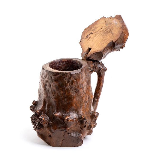 in legno, a forma di radice di albero. Questa tipologia di boccali erano artigianali, scolpiti direttamente da sezioni nodose di radici o ceppi, che venivano scelti per la loro forma irregolare. Questo tipo di oggetto rientra nella tradizione dei cosiddetti "treen", ovvero piccoli oggetti domestici in legno tornito o scolpito a mano, di origine popolare. In Irlanda, la lavorazione della radice aveva anche una valenza simbolica: si credeva che la radice conservasse la forza vitale dell’albero. I nodi e le imperfezioni del legno venivano lasciati a vista e persino valorizzati, proprio per sottolineare l’origine organica e naturale del pezzo.