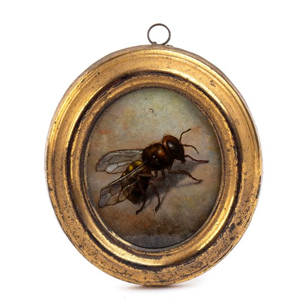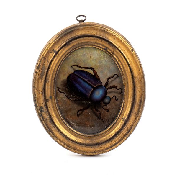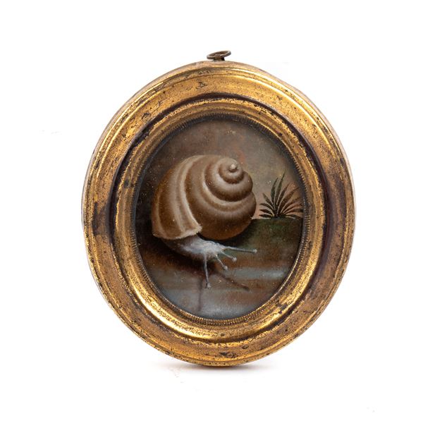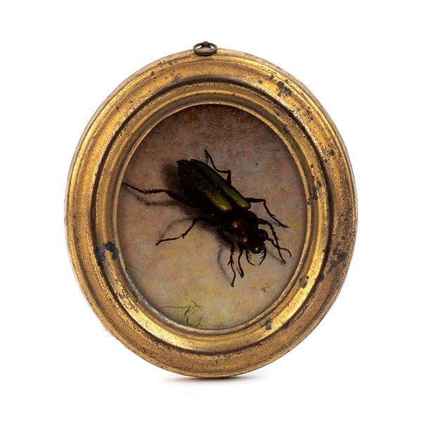 cornici in ottone dorato, di forma ovale, con all'interno tre raffigurazioni di insetti e una di lumaca.