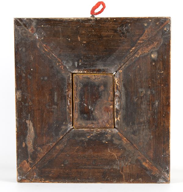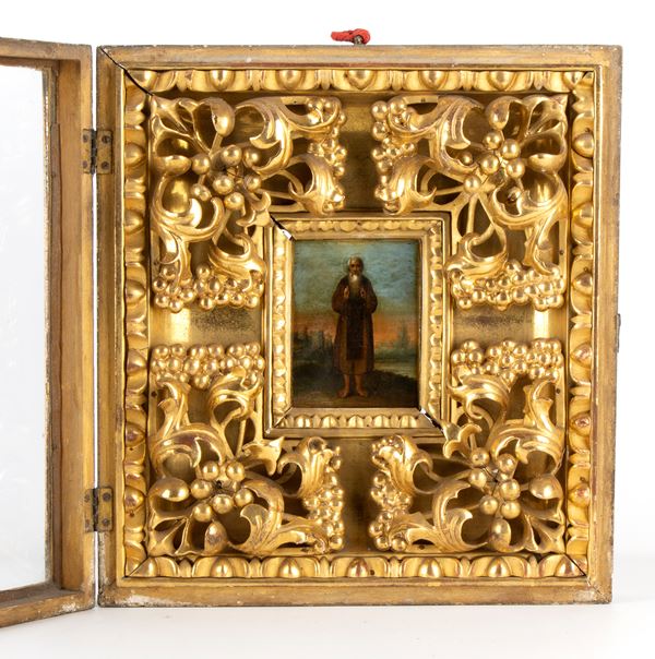 Entro cornice dorata decorata con grappoli d'uva, collocata entro una teca.
