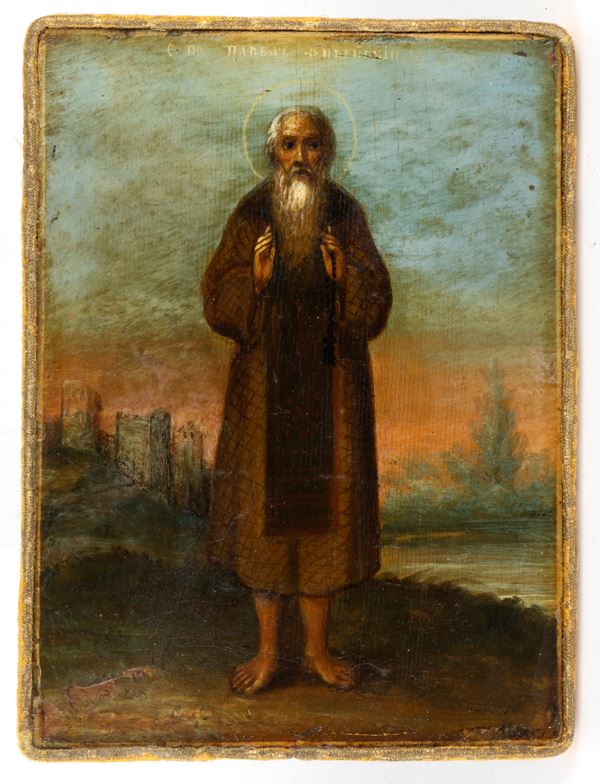 raffigurante a figura intera, San Paolo Taumaturgo, il primo eremita cristiano, che appare anziano e posto al centro dell’icona, circondato dal deserto, simbolo della sua scelta di vita ascetica. Questo richiamo è evidenziato anche dalla sua tunica da eremita e dalla lunga barba e capelli bianchi, segni della sua esperienza e dedizione spirituale. Solitamente, come in questa rappresentazione, è raffigurato con le mani in preghiera, espressione della sua profonda comunione con Dio.