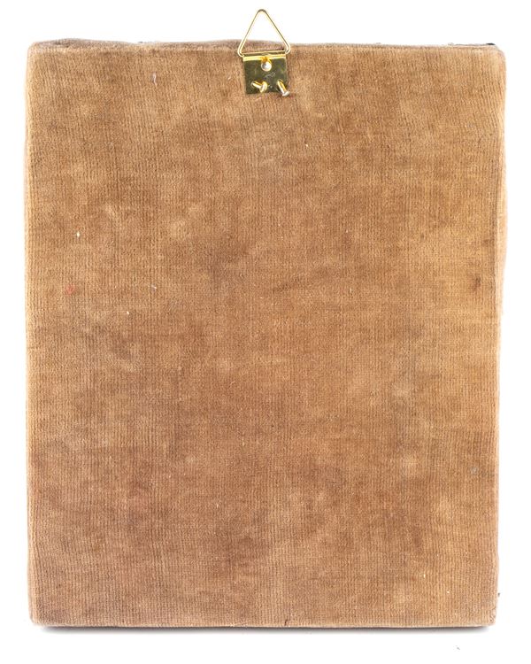 tempera su tavola raffigurante il Cristo Pantocratore con aureola, vesti, attributi e sfondo in argento. Il retro in velluto rosa.