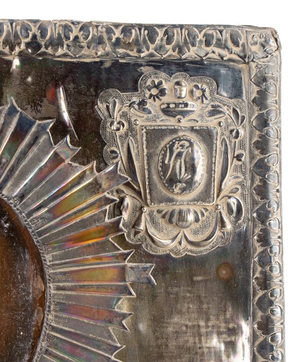 rappresentato con aureola, vesti, attributi e sfondo in argento.