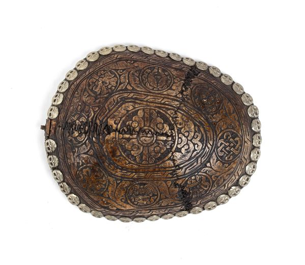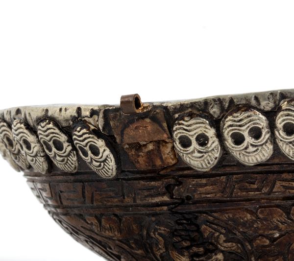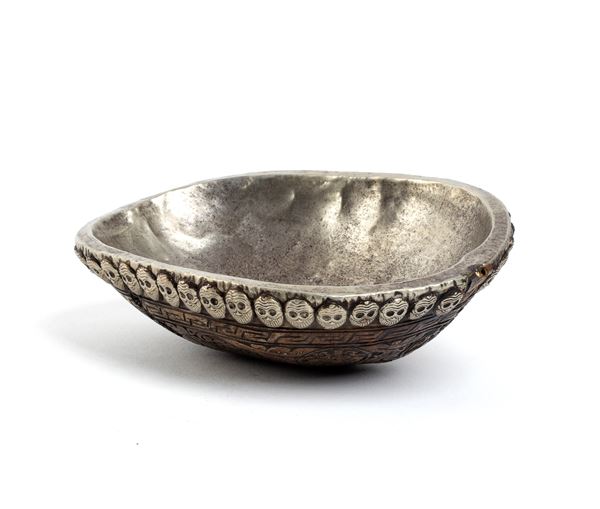 tradizionale coppa rituale tibetana, usata nei rituali tantrici del Buddhismo Vajrayāna, in particolare nelle pratiche associate a offerte sacrificali simboliche. Il bordo esterno della coppa è decorato da una sequenza di piccoli teschi. che richiamano iconograficamente il ciclo della morte e della rinascita, temi centrali nella dottrina buddhista esoterica. L’interno del cranio è completamente rivestito in metallo, sia per ragioni rituali che conservative. La parte superiore del rivestimento presenta due fasce decorative concentriche, finemente incise con motivi che possono includere elementi floreali stilizzati, simboli tantrici o iconografie sacre, distribuite in modo ordinato.