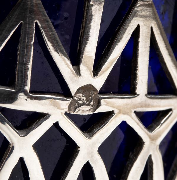 poggiante su base quadrata, corpo traforato con motivi geometrici, manico ad ansa e coperchio incernierato cimato da una presa a forma di pigna.