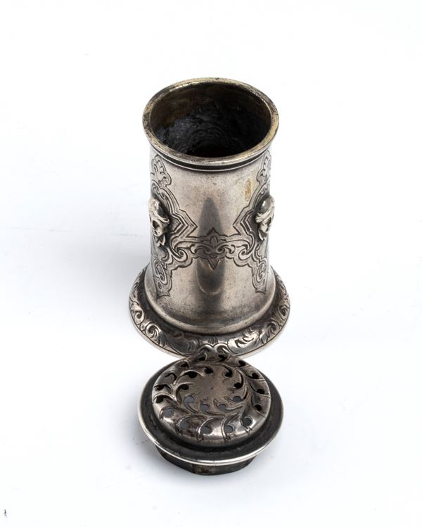 di forma cilindrica, poggiante su base rotonda; corpo decorato con incisioni a motivi vegetali e volti femminili.