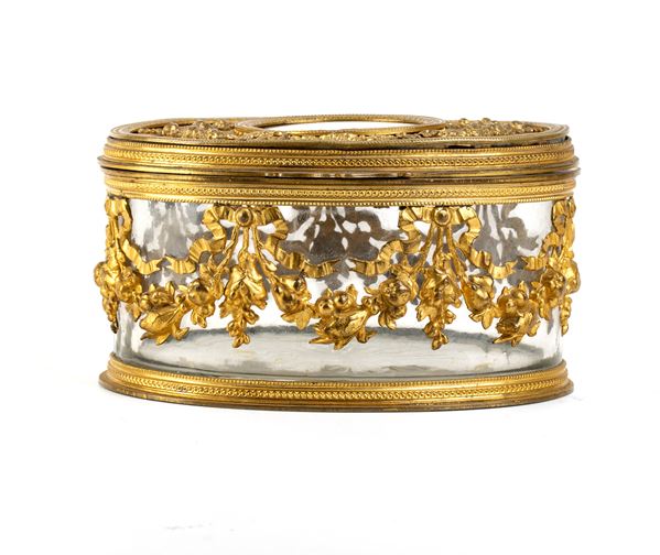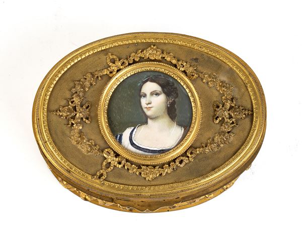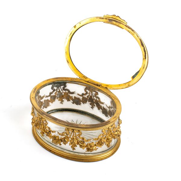 di forma ovale, decorata con motivi floreali e ghirlande; coperchio incernierato con miniatura raffigurante il volto di una figura femminile. Contenitore interno in vetro molato.