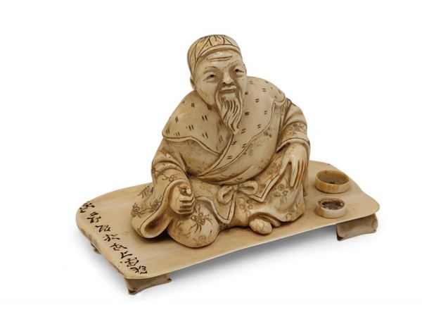 Raffigura un personaggio maschile anziano, probabilmente un saggio o una figura simbolica, seduto in posizione rilassata. La sua espressione è ben definita, con lineamenti sereni e un volto adornato da una lunga barba, simbolo tradizionale di saggezza e longevità. Indossa una veste decorata con incisioni e motivi stilizzati che rappresentano l'attenzione per il dettaglio tipica delle lavorazioni di quel periodo.