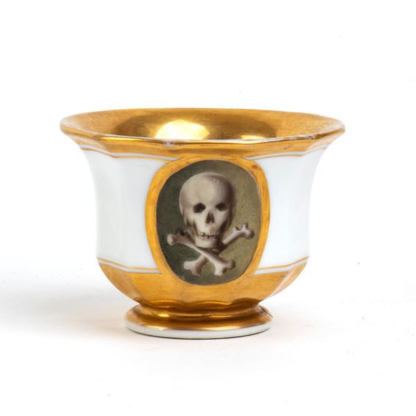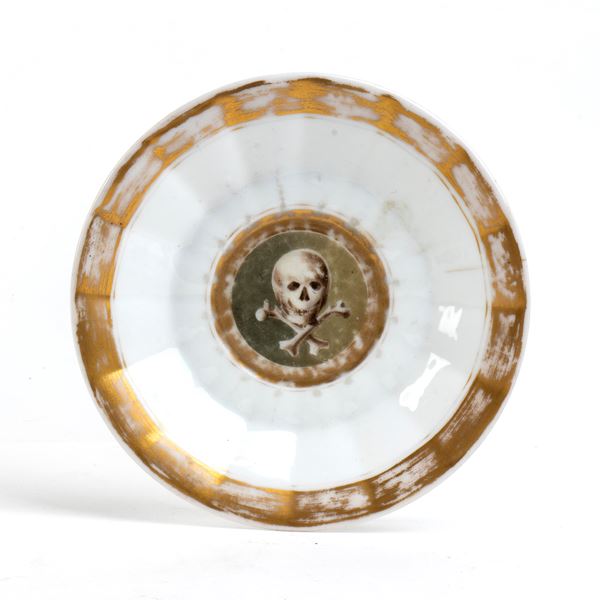 Sia la tazza che il piattino presentano al centro un teschio con tibie incrociate in stile memento mori, incorniciato in un ovale su fondo verde e circondato da dettagli dorati applicati a pennello, motivo ripreso anche lungo i bordi.