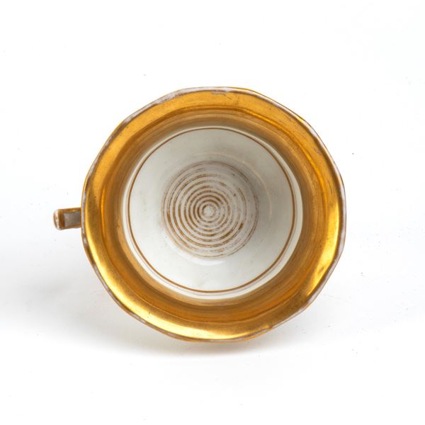 tazzina con bocca svasata, profilo scanalato e dettagli dorati, e da un piattino abbinato con decori coordinati.