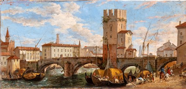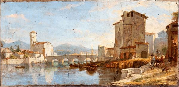 a) Veduta di Pisa venendo da Livorno; b) Veduta di Verona nei pressi del Ponte Navi. Coppia di dipinti