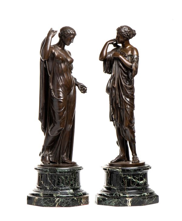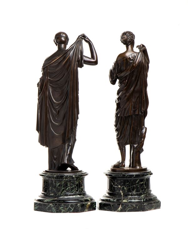 raffiguranti due figure in abiti classici, poste su basamenti a plinto in marmo verde Alpi.