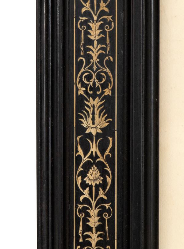 Questo elegante cornice rappresenta un esempio significativo della raffinata ebanisteria lombarda della seconda metà del XIX secolo. Realizzata in legno ebanizzato, è impreziosita da intarsi in avorio di elefante (Elephas maximus Linnaeus, 1758 o Loxodonta africana Blumenbach, 1797) incisi a graffio e ripassati a china con motivi che riproducono motivi decorativi vegetali e geometrici, tipici del gusto eclettico dell'epoca.