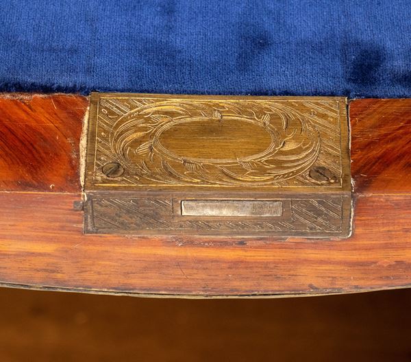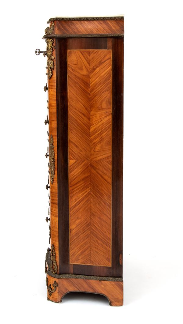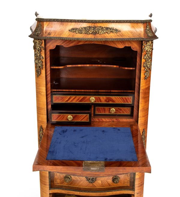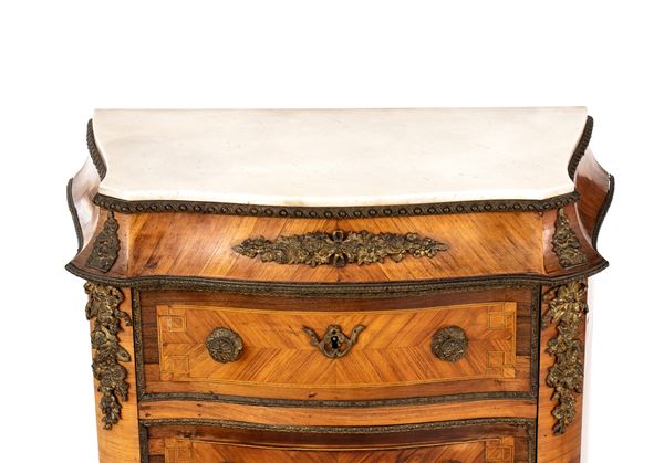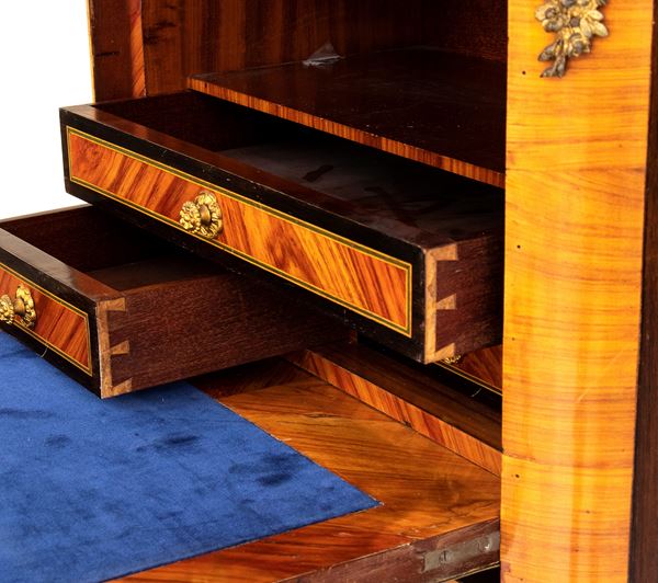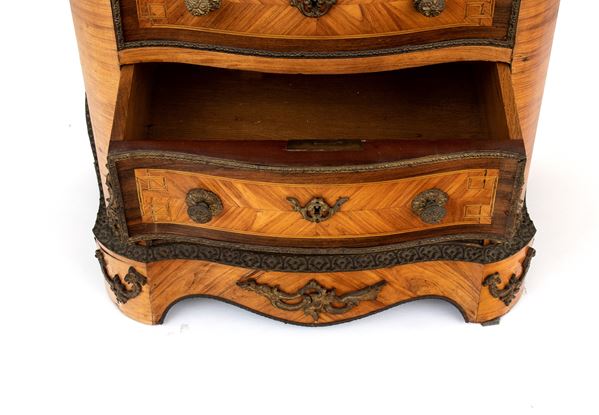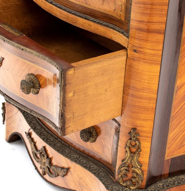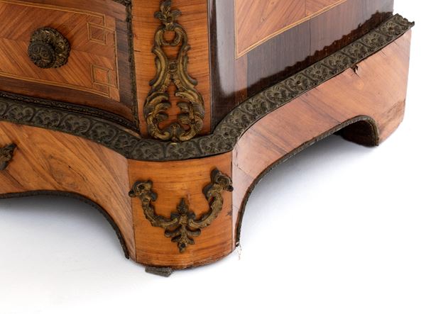 epoca Napoleone III, seconda metà dell'ottocento, in ebano viola (Dalbergia cearensis) e palissandro (Dalbergia spp), arricchito da applicazioni in bronzo dorato cesellate con motivi a foglie, ghirlande e rosette. Pomelli , maniglie e bocchette anch'essi in bronzo finemente lavorato. Basamento sagomato , piedini mossi e profili modanati.