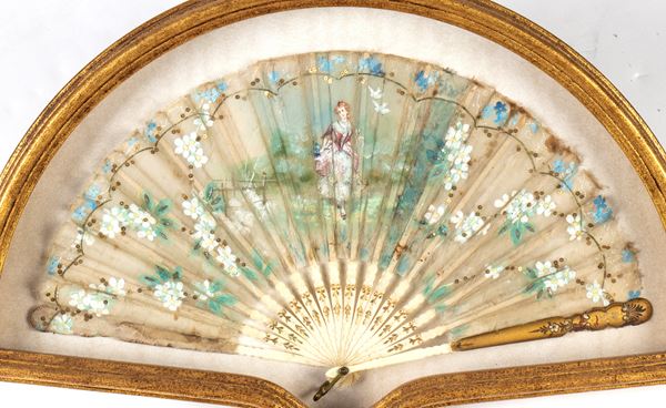 pieghevole realizzato con stecche in osso finemente intagliato. La parte decorata, dipinta a mano, mostra un ricco motivo floreale con una figura femminile posta al centro, elegantemente vestita, che dona movimento e leggerezza alla composizione. Il ventaglio è esposto in una cornice semicircolare, dorata e lavorata con gusto ornamentale.
