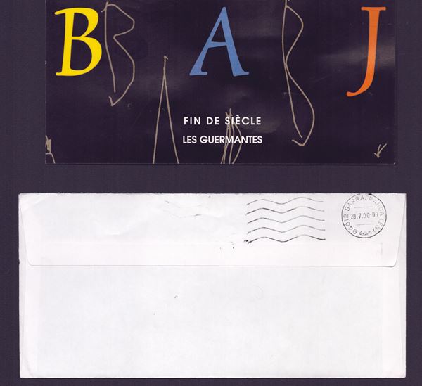 Collage su invito alla mostra, 100 x 2100 mm. Firmato al verso. Entro busta da lettera originale.