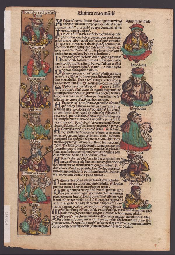 Bella impressione con coloritura coeva, stampata su carta vergata. Con testo in latino e illustrazione dei re sul verso. Foglio in ottimo stato, salvo uniforme brunitura e qualche leggera macchia.