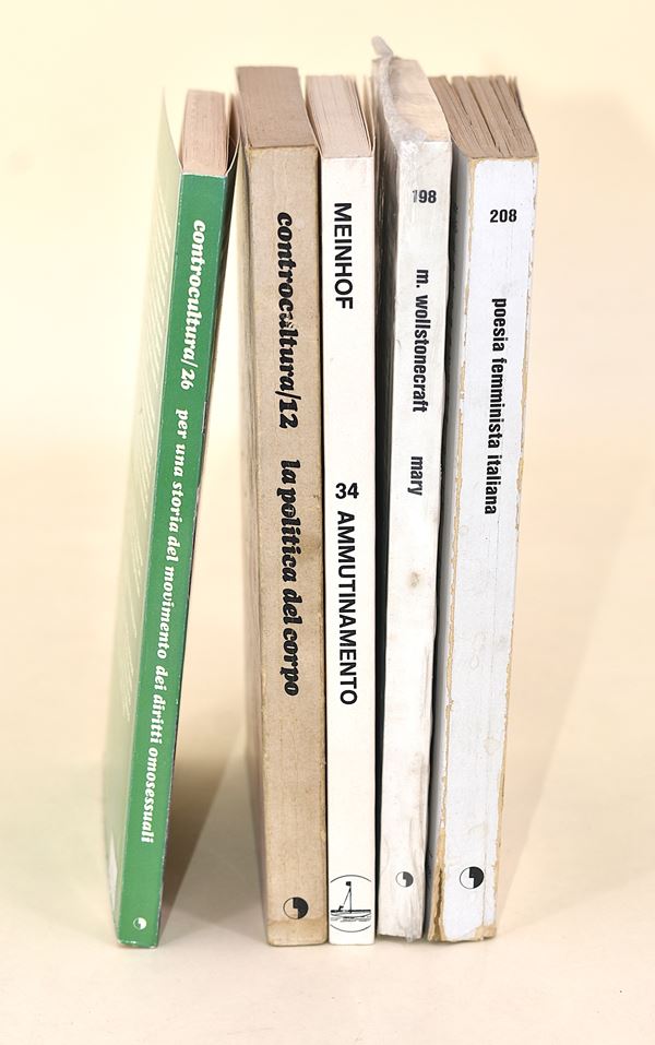John Lauritsen, David Thorstad, Per una storia del movimento dei diritti omosessuali 1864-1935 (1979). La politica del corpo (1976). Ulrike Meinhof, Ammutinamento. Storie di adolescenti in un riformatorio femminile tra solitudine e rivolta (1980). Mary Wollstonecraft, Mary. Un romanzo. La quasi autobiografia di una femminista del '700 (come nuovo). Poesia femminista italiana (a cura di Laura di Nola, come nuovo).