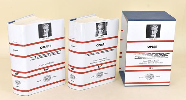 Opere I-II. Completa in 2 volumi con copertina rigida e cofanetto rigido editoriale (Giulio Einaudi NUE, 1997). Opere I-II. 2 volumi in piena similpelle con cofanetti editoriali flessibili (Giulio Einaudi Biblioteca dell'Orsa, 1987-1988). Lezioni di Primo Levi. 2 volumi in brossura editoriale (incellofanati): 1) Stefano Bartezzaghi, Una telefonata con Primo Levi. 2) Massimo Bucciantini, Esperimento Auschwitz.