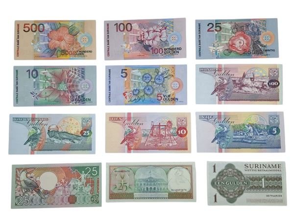SURINAME. Lotto di 12 banconote. Date, tagli e conservazioni varie.