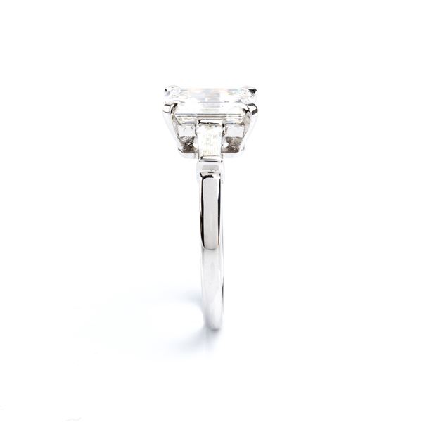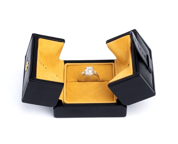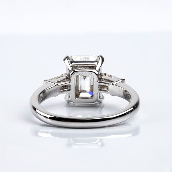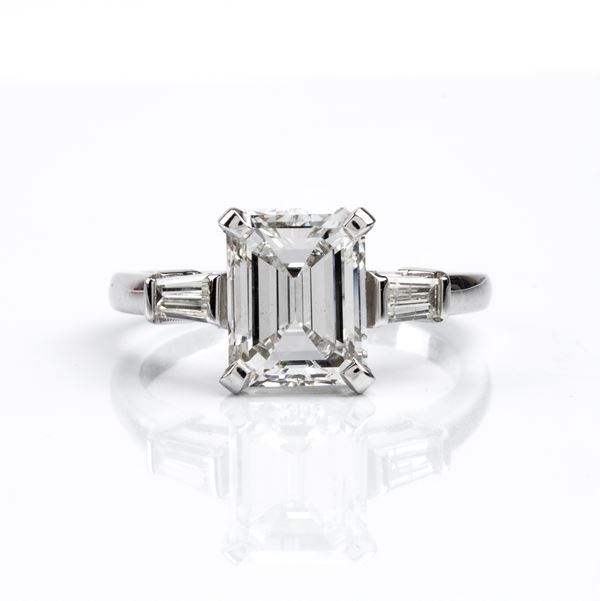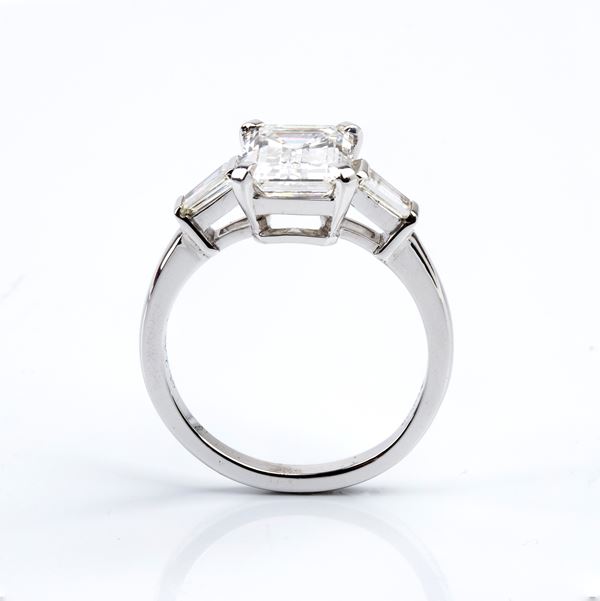 N. 01 diamante di forma ottagonale, taglio a gradini, stimato per un peso totale di circa 2.48 ct, colore F-G, purezza VVS e coppia di diamanti di forma trapezoidale, taglio tapered, stimati per un peso totale di circa 0.40 ct, colore G-H, purezza VS-SI, VS, come misurati e classificati nella montatura.