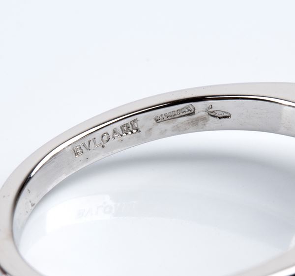 montatura in oro bianco 18k, incastonato con diamante centrale ottagonale affiancato da coppia di diamanti tapered. Firmato BULGARI. Accompagnato da scatola originale.