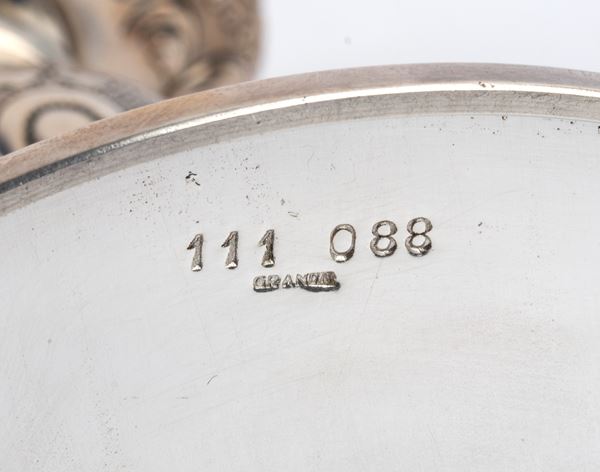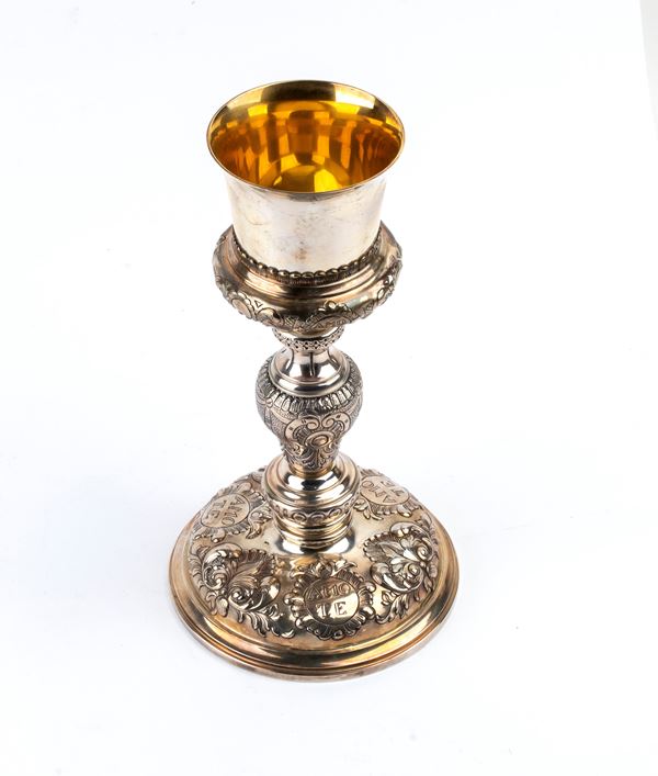 in argento realizzato a sbalzo e cesello, a base circolare, fusto a balaustro e nodo centrale, avente la coppa dorata internamente. Tutta la superficie è riccamente decorata con motivi a volute fogliate e floreali e sulla base presenta.