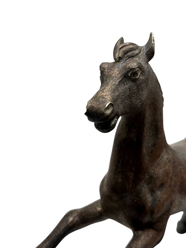 a forma di cavallo rampante in argento 800/1000 con base rettangolare in legno.