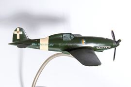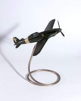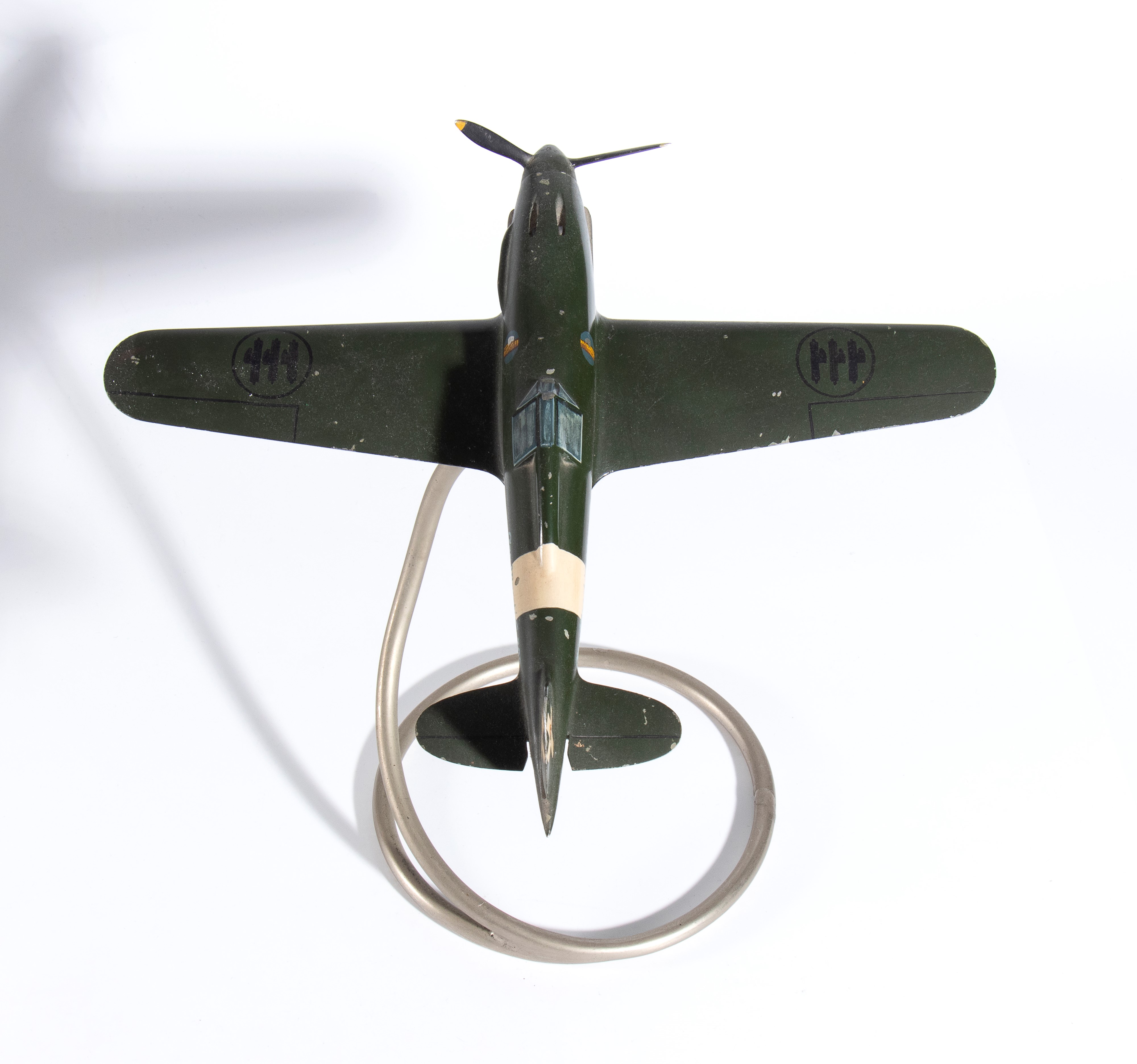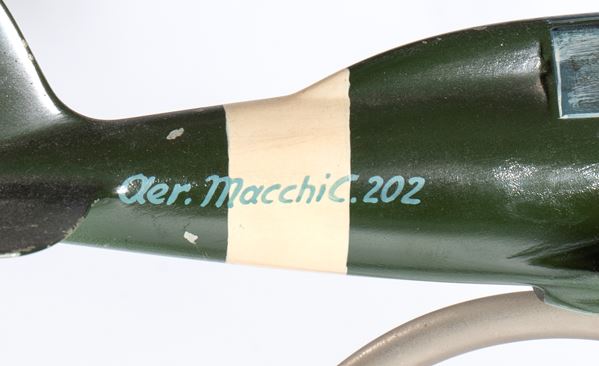 Modello in fusione di alluminio autarchica del G202 caccia della AER MACCHI. Elica tripale girevole, livrea originale periodo bellico, Regno d'Italia con emblemi fascisti sulla fusoliera. Piedistallo a spirale in metallo, originale, con snodo alla pancia dell'aereo per regolarne il posizionamento.