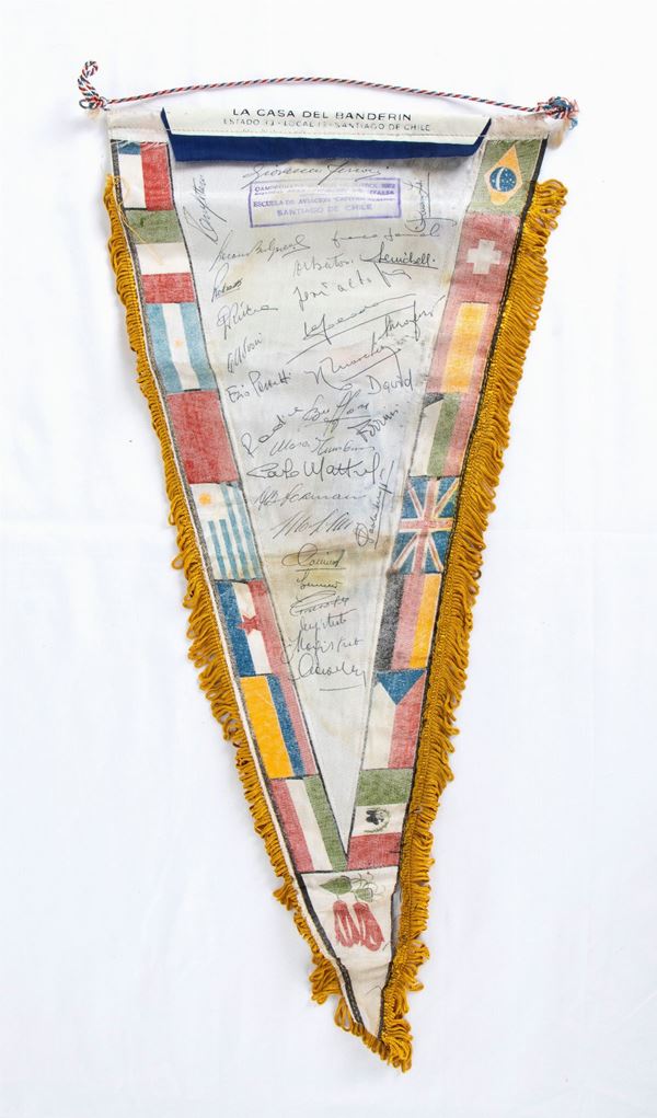 Gagliardetto originale per i mondiali di calcio di Cile 1962 con autografi dei calciatori italiani. Immagine stampata di uno stadio di calcio, bandiere delle nazionali partecipanti, la coppa Rimet e la scritta CAMPEONATO MUNDIAL DE FUTBOL - COPA JULES RIMET CHILE 1962 . Al retro del gagliardetto presenti 30 autografi dei calciatori della nazionale italiana. Gli autografi sono originali, scritti di pugno. Si riconoscono Trapattoni, Buffon, Bulgarelli, Robotti, Rivera, Pascutti, Radice, David, Maschio, Sormani, Mattrel, Albertosi ed altri. Completo di asta. Con marchio LA CASA DEL BANDERIN - Santiago del Chile, con timbro "Escuela de Aviacion Capitan Avalos". In ottime condizioni