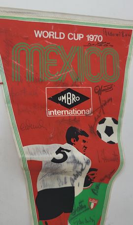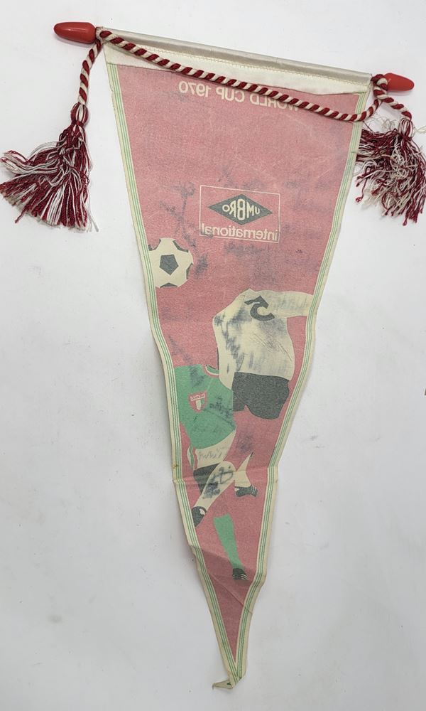 Gagliardetto originale per i mondiali di calcio di Mexico 70 con autografi dei calciatori italiani. Immagine di calciatori in azione e la scritta WORLD CUP 1970 MEXICO con lo sponsor UMBRO INTERNATIONAL. Gli autografi sono originali, scritti di pugno dai calciatori della nazionale italiana. Si riconoscono Boninsegna, De Sisti, Furino, Bertini, Gigi Riva, l'allenatore Valcareggi. Alcune firme sbiadite. Completo di asta.