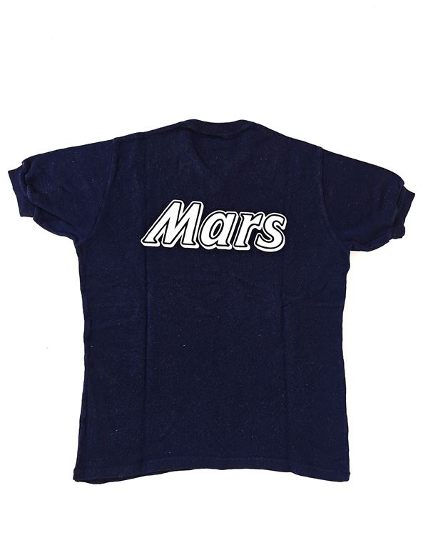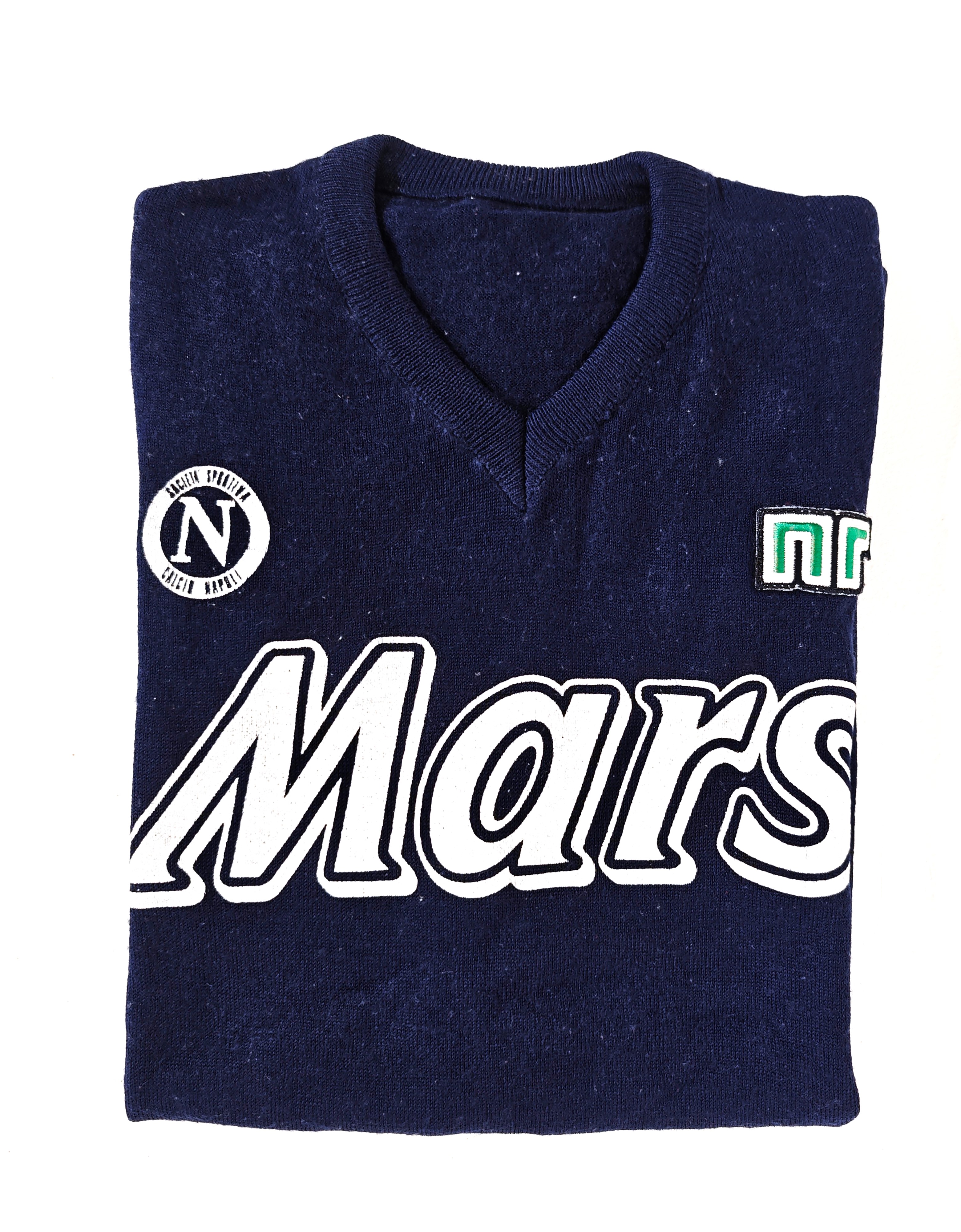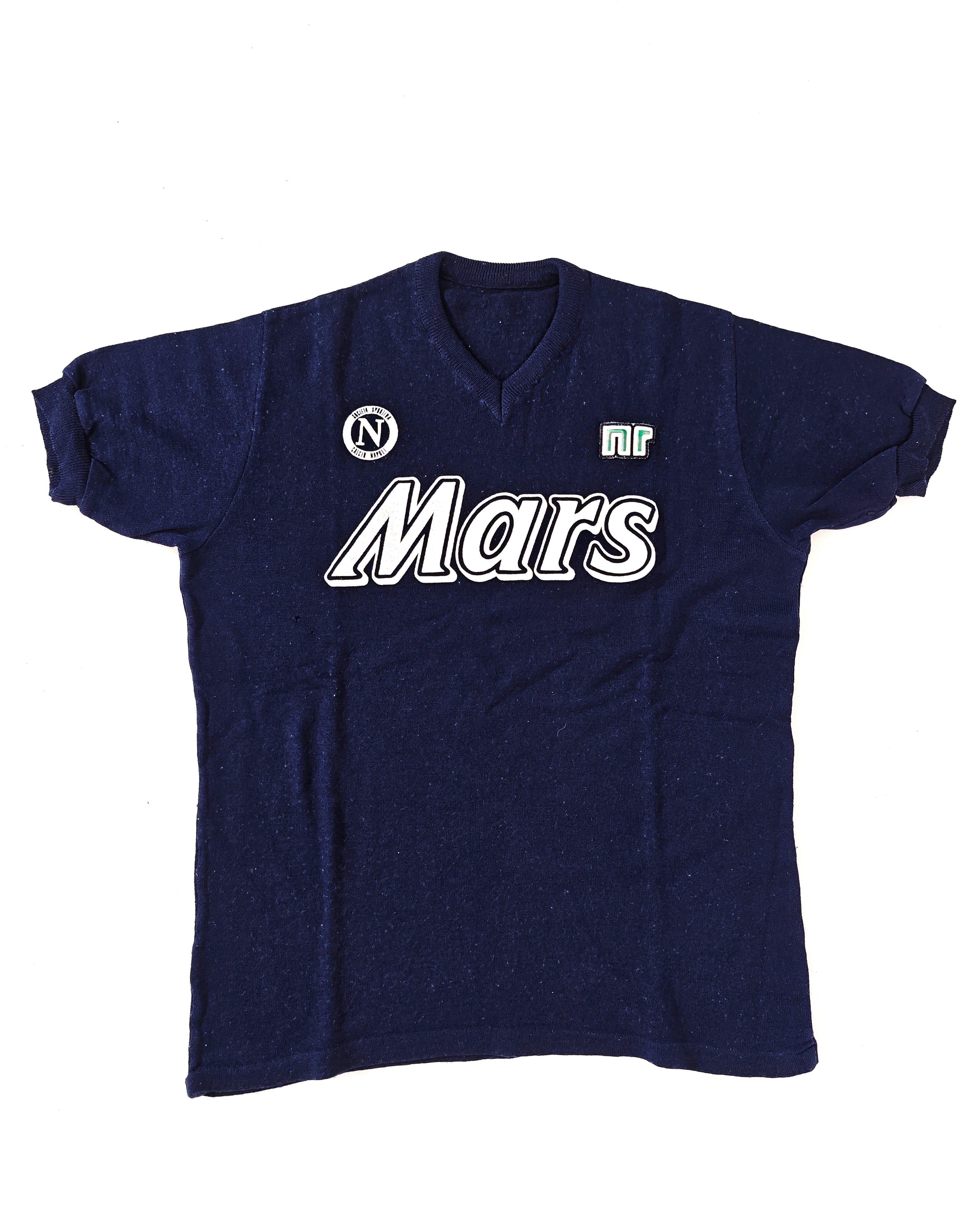 Maglia maniche corte, in cotone pesante, scollo a V, sponsor MARS stampato al petto e sulla schiena, patch rotonda ricamata Società Sportiva Calcio Napoli, cucita a destra, patch con logo NR (EnneErre) cucita a sinistra.