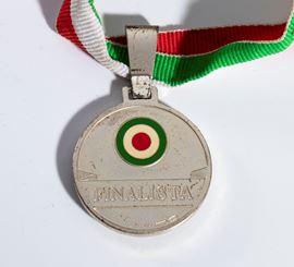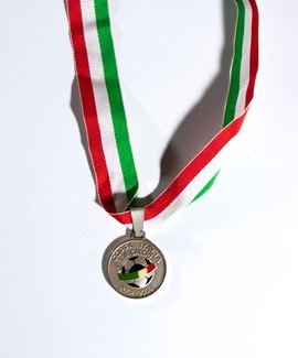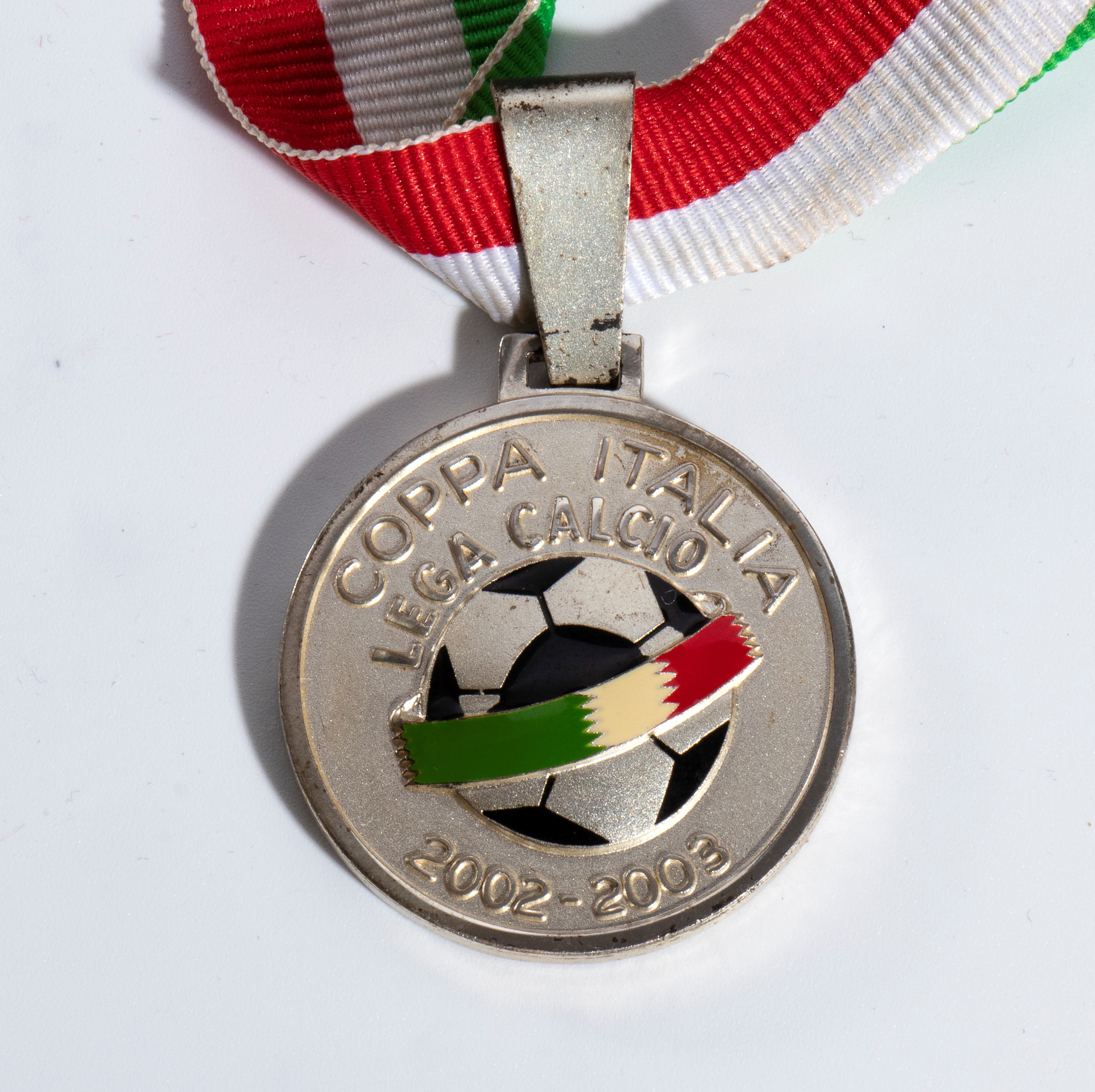 Medaglia per calciatore FINALISTA della Coppa Italia edizione 2002-2003 , trofeo assegnato in doppia sfida fra i team di Roma e Milan. La medaglia in oggetto è appartenuta ad un calciatore della squadra classificatasi al secondo posto, ovvero la AS ROMA. Argento bollato, smalti originali, misura mm.35 di diametro, pesa circa gr.30, completa del suo nastrino tricolore originale.